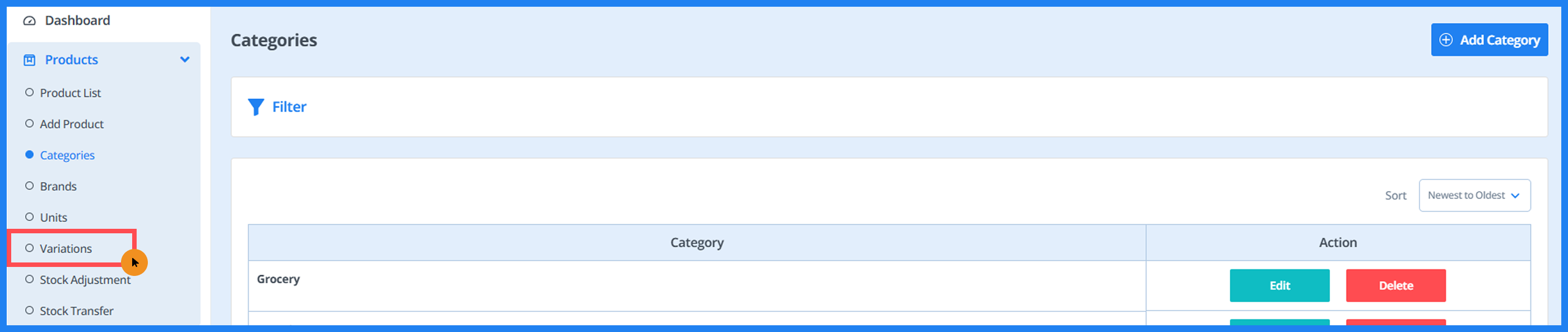 - To access the variation list, click on "Variation" under Products in the sidebar.