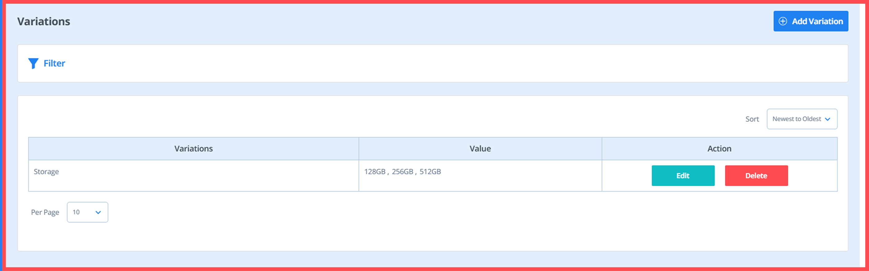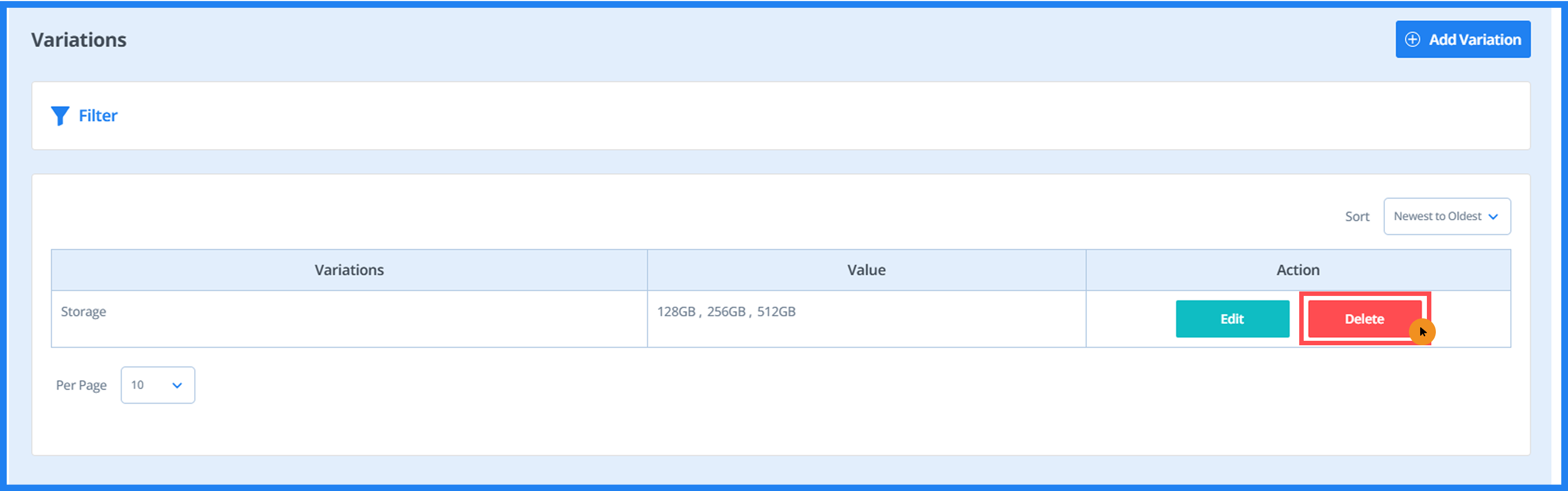 - To delete a variation, click the 'Delete' button.