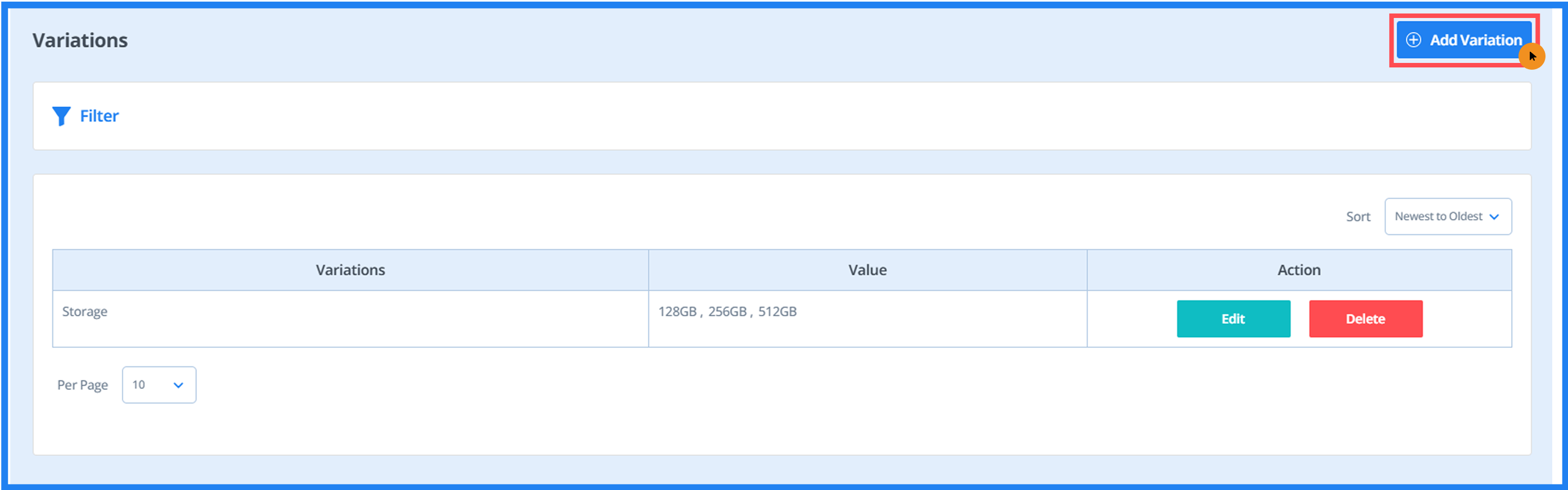 - Click the 'Add Variation' button to add a variation.