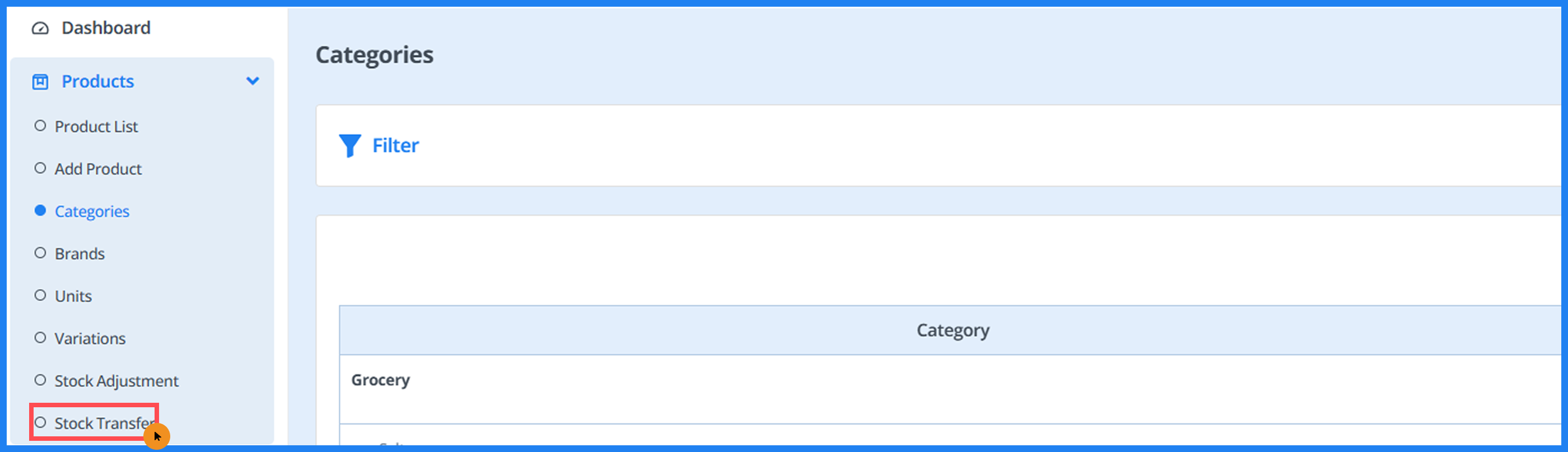 - Click 'Stock Transfer' in the sidebar to open the Stock Transfer page.