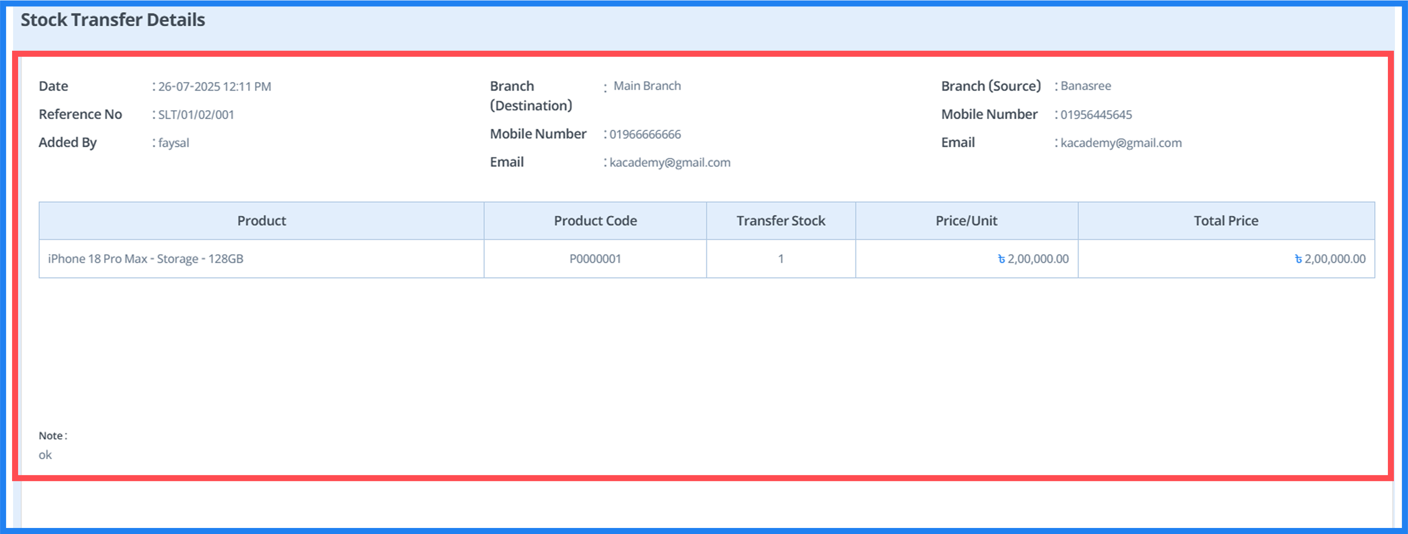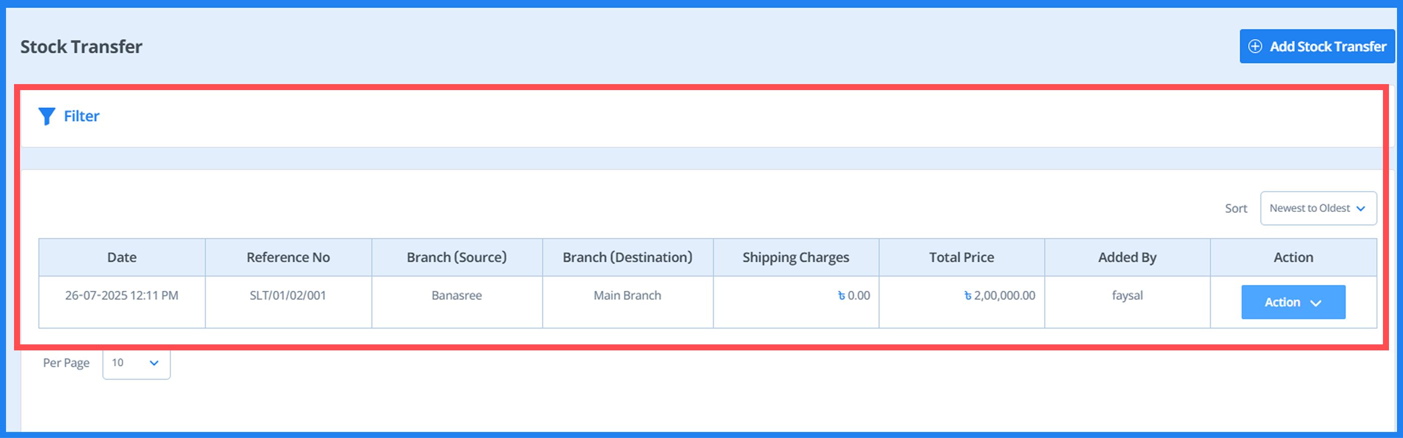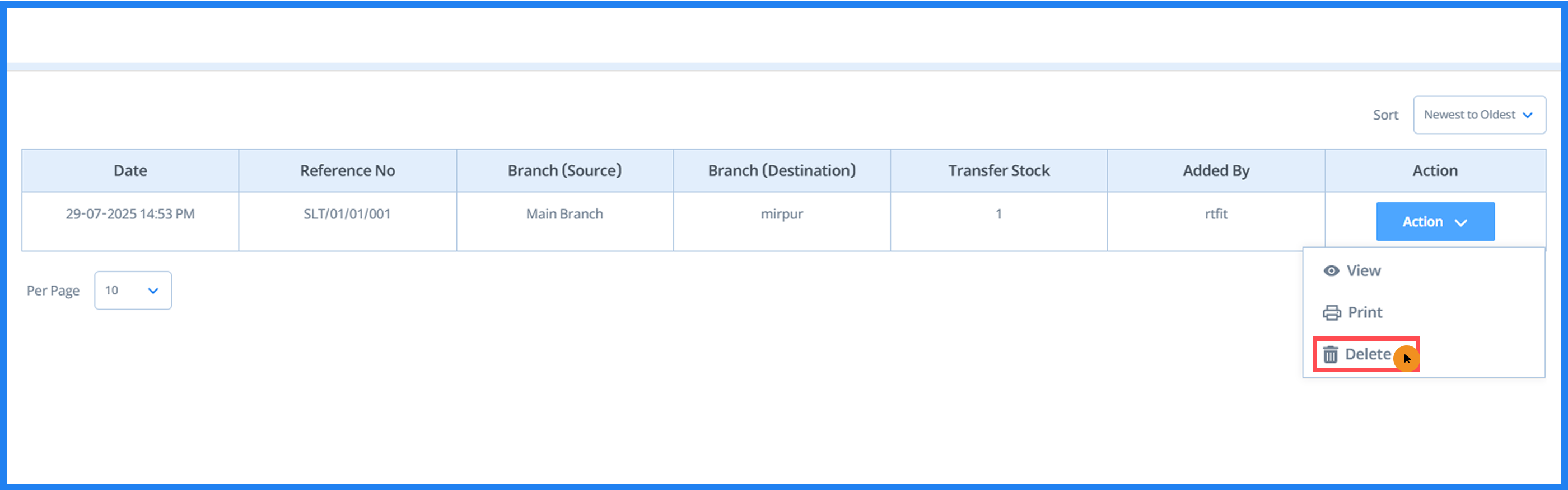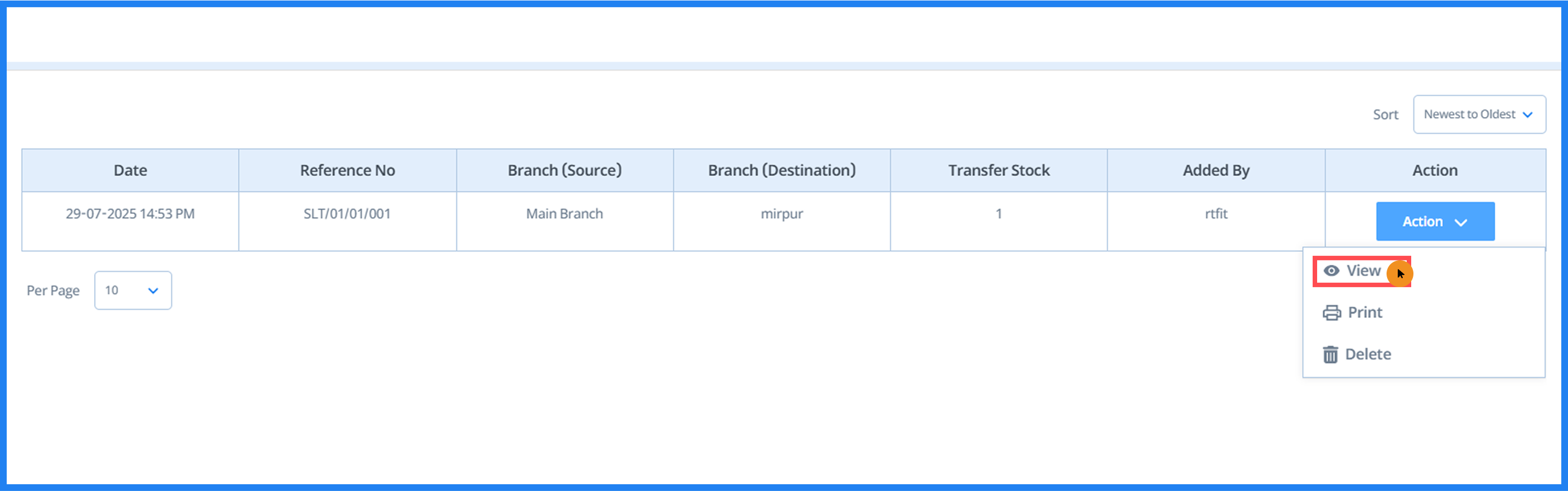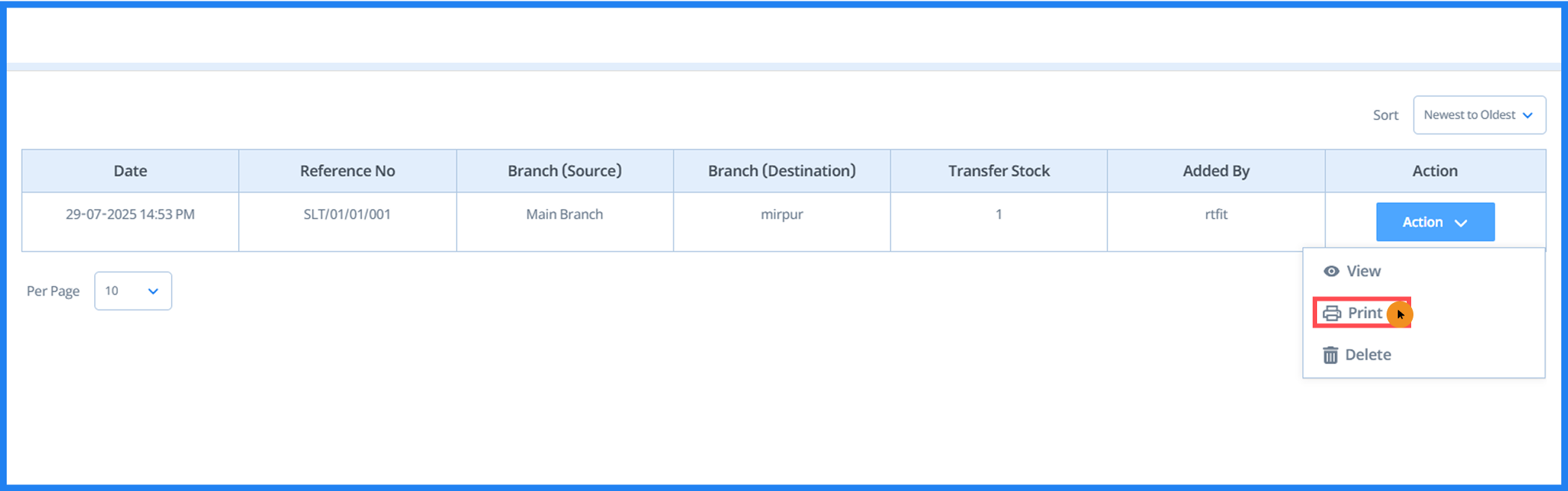 - Here, you can view the date, reference number, source branch name, destination branch name, total price, and added by. You can also view, print, or delete entries.