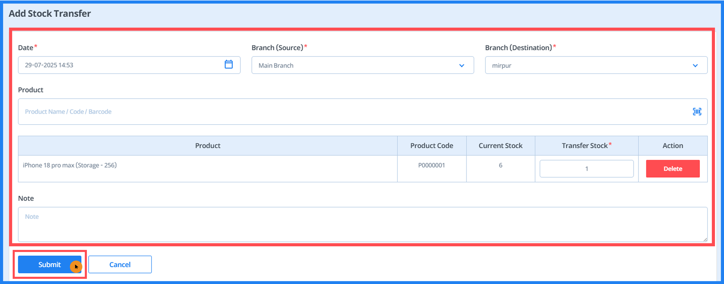 - Click “Submit” to save the stock transfer to the stock transfer list.