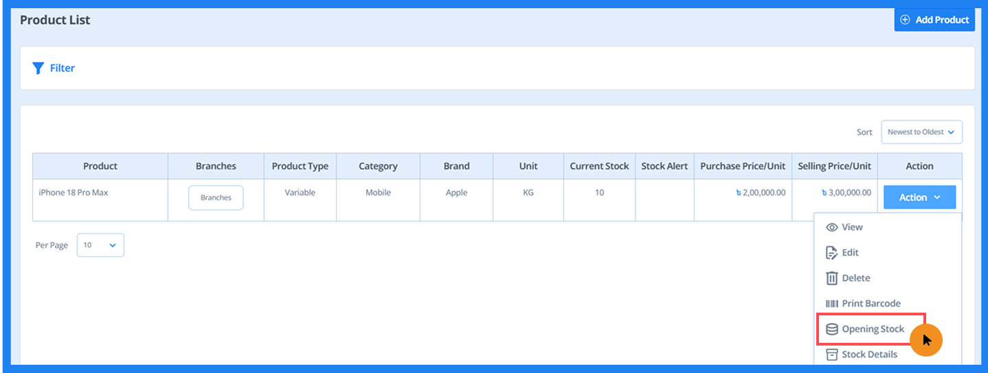 - You can access Opening Stock from the Product List or Add Product page.