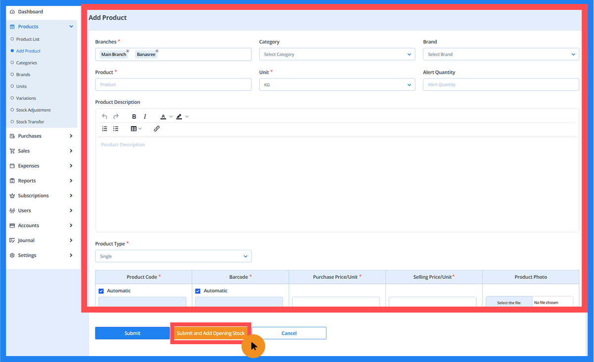 - From the Add Product page, click the 'Submit and Opening Balance' button to access the opening balance.