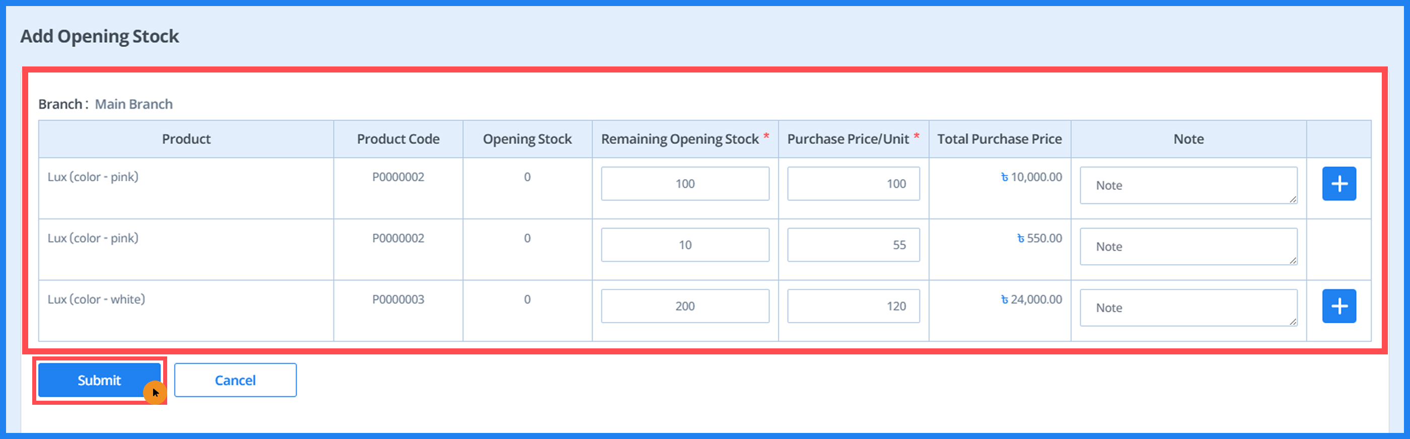 - You can add multiple opening stock entries for the same branch with different prices or dates.