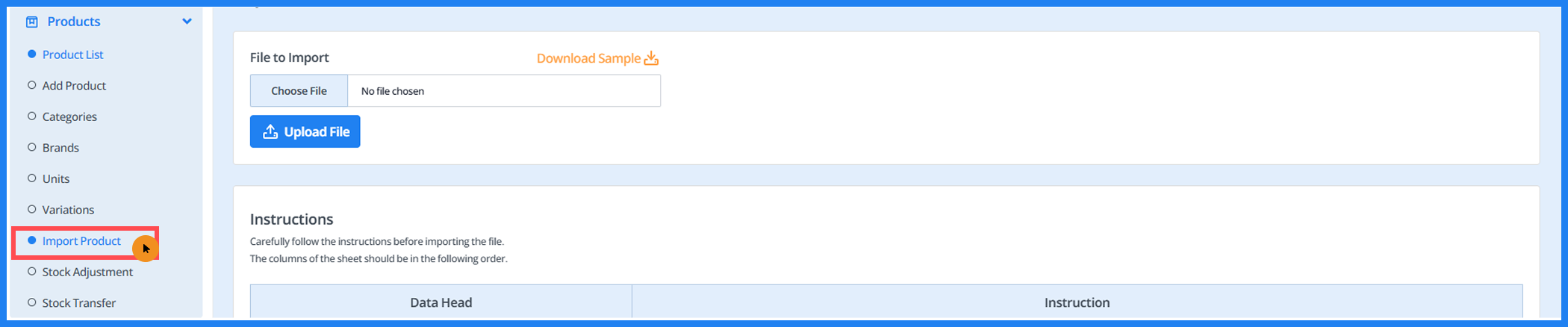 - To access product import, click on "Product Import" under Products in the sidebar.