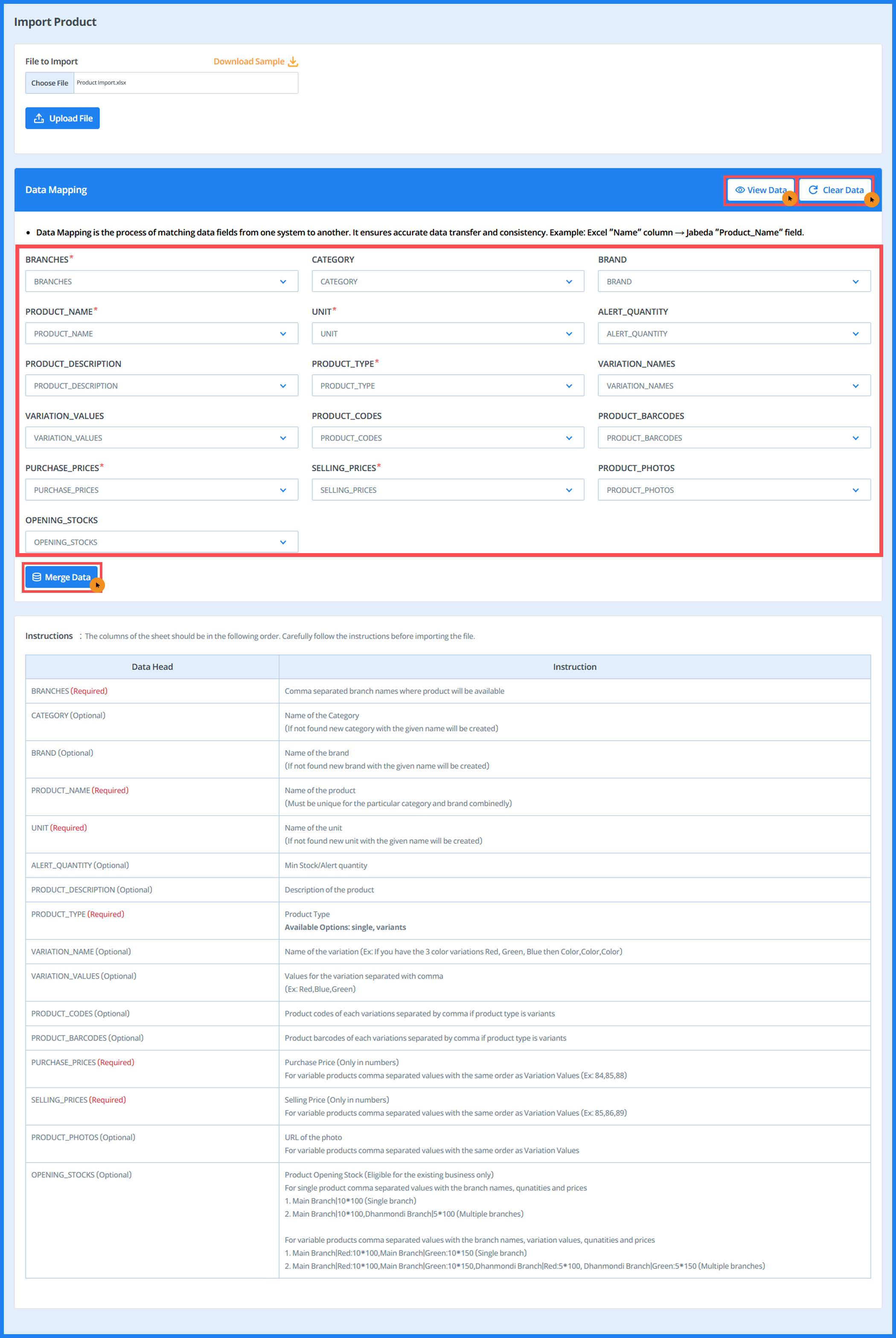 - Click 'Merge Data' to upload and save your previous business records in Jabeda.