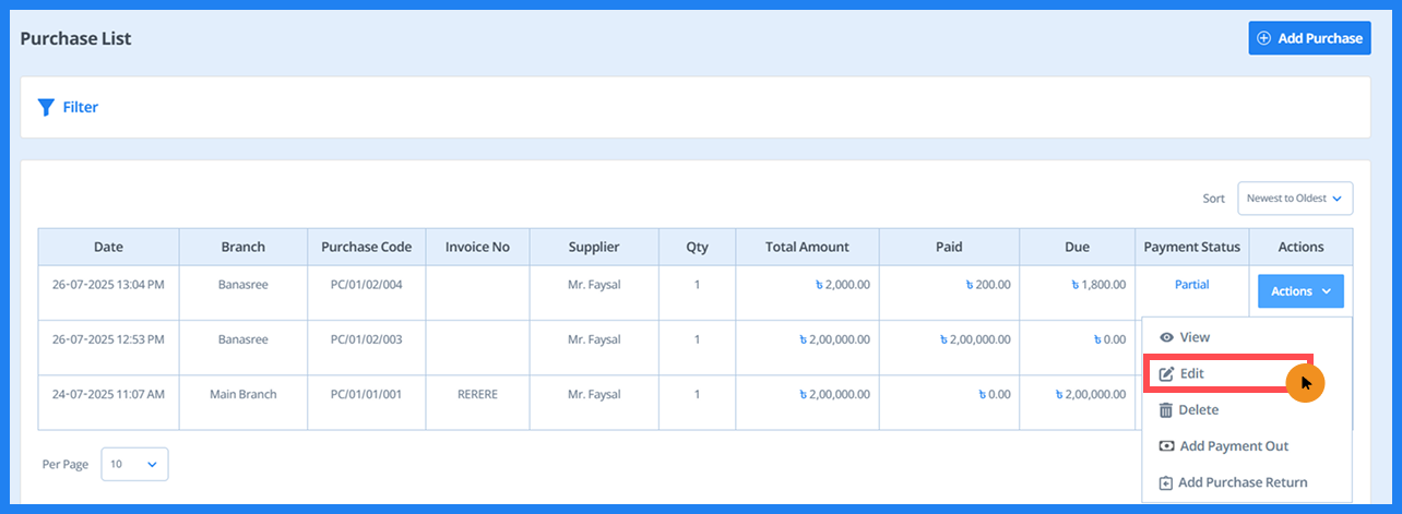 - To access the edit purchase option, click on "Purchase List" under Purchase in the sidebar. Then, from the action button in the purchase list, select Edit Purchase to edit the purchase.