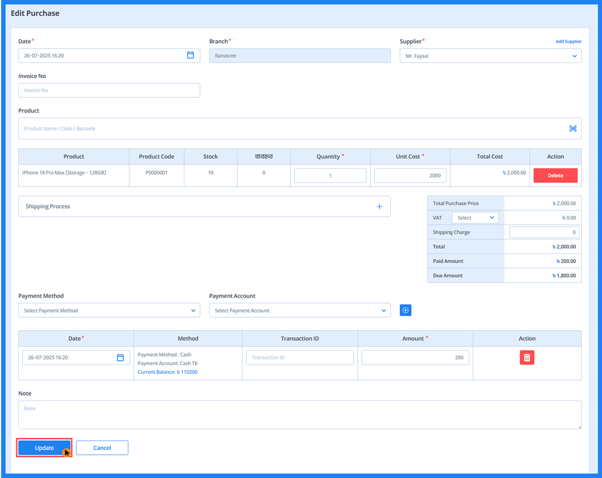 - Click 'Update' to save changes on the Edit Purchase page.