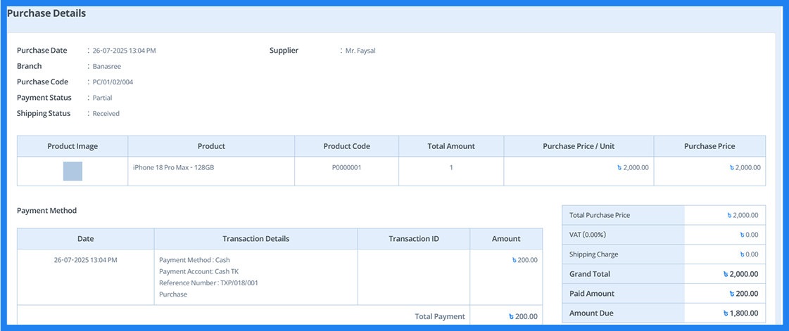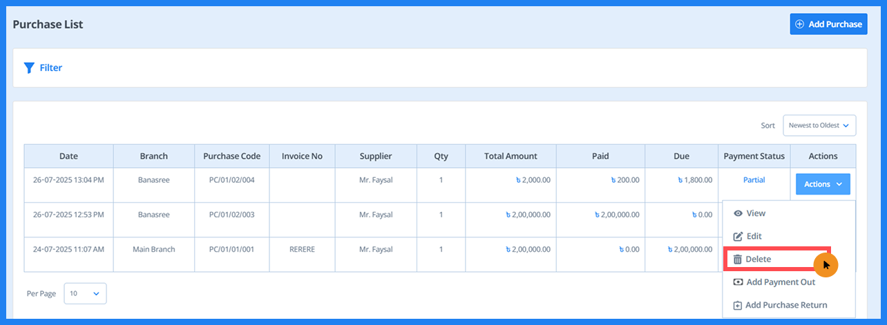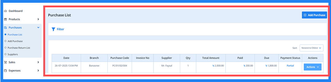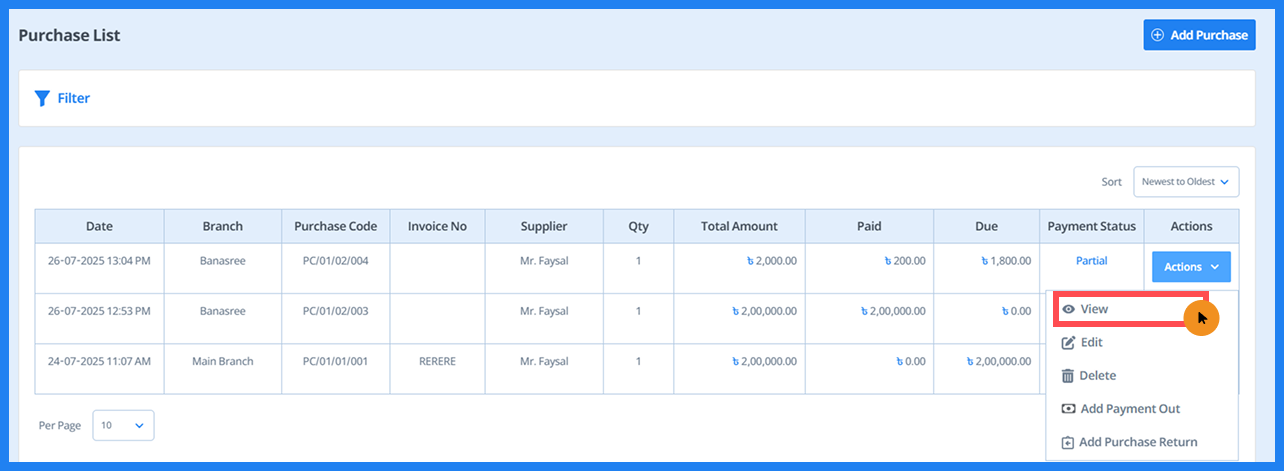- Here, you can view details such as date, branch, purchase code, invoice number, supplier, quantity, total amount, paid amount, due amount, and payment status. You can also filter the information as needed. Additionally, you can view, edit, or delete entries.