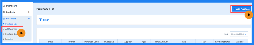 - To access the purchase list, click on the "Purchase List" sub-module under the "Purchase" module in the sidebar.