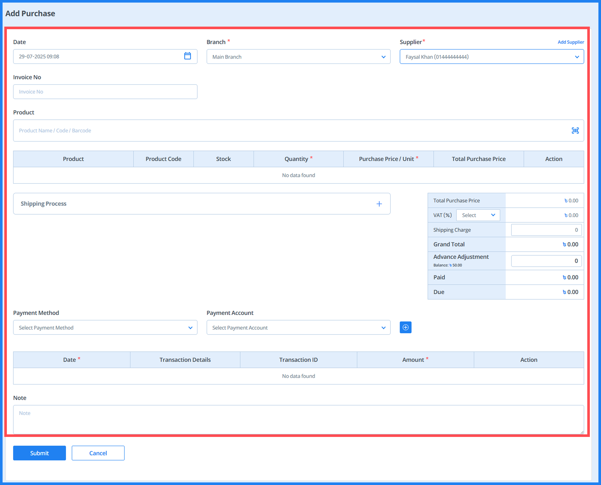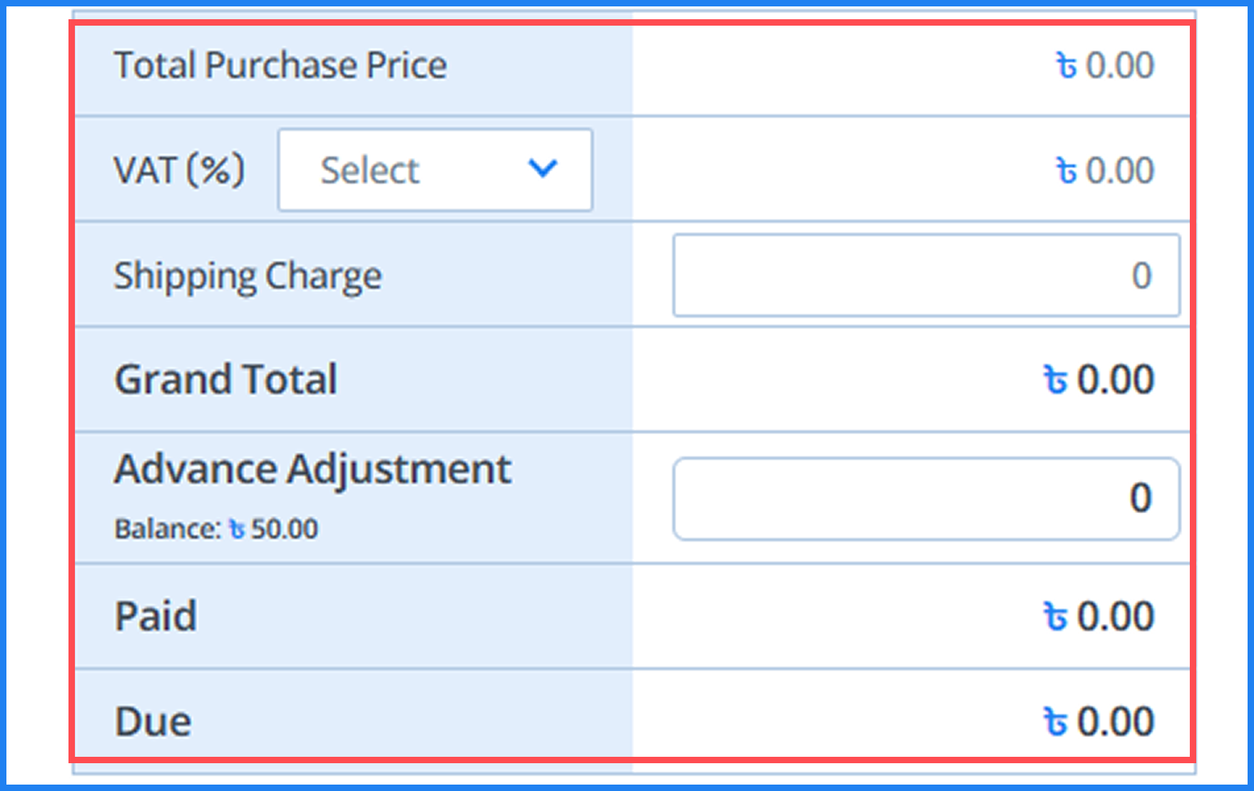 - Here, enter the shipping charge, select VAT, apply a discount, and add any additional expenses.