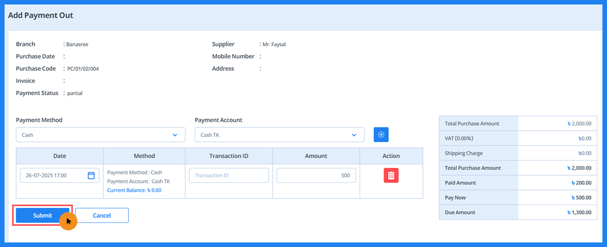 - First, select the payment method, then select the payment account. Click the ‘+’ button to add a payment row.