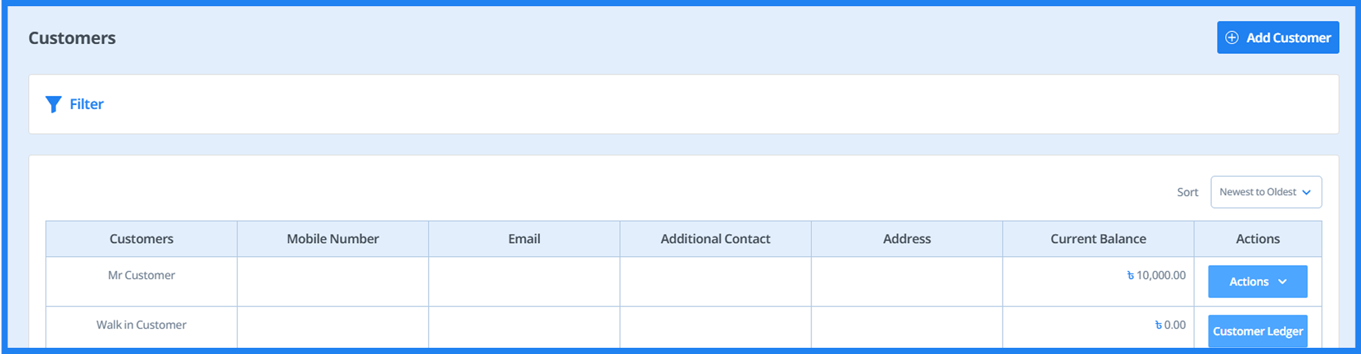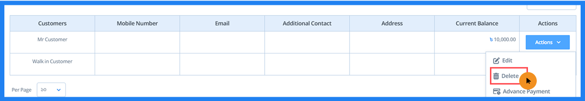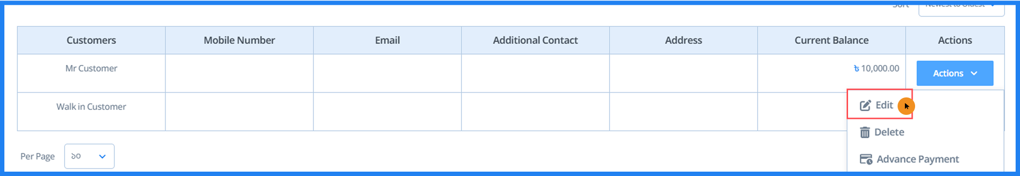 - Here, you can see each customer’s name, mobile number, email, additional contacts, address, and current advance balance. You can also edit or delete any customer’s information.