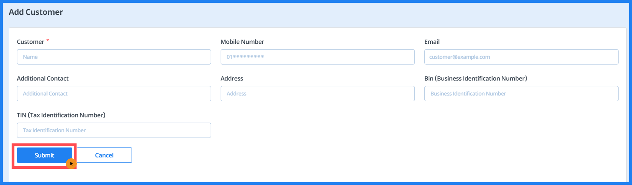 - Fill in all the mandatory fields and click Submit to add the customer.