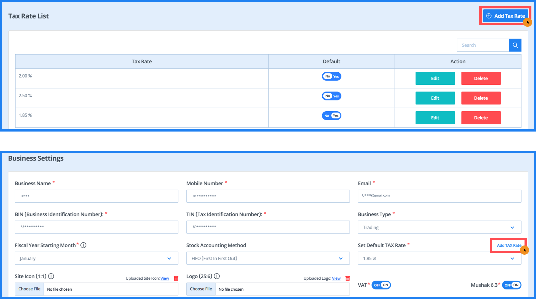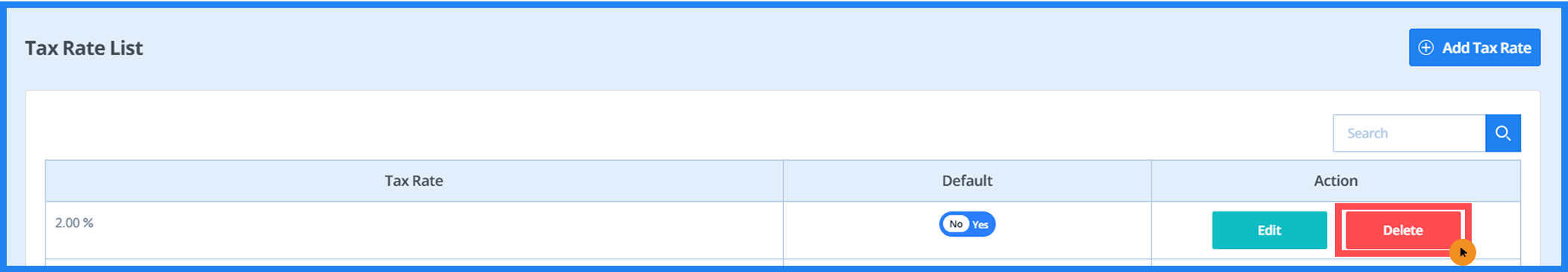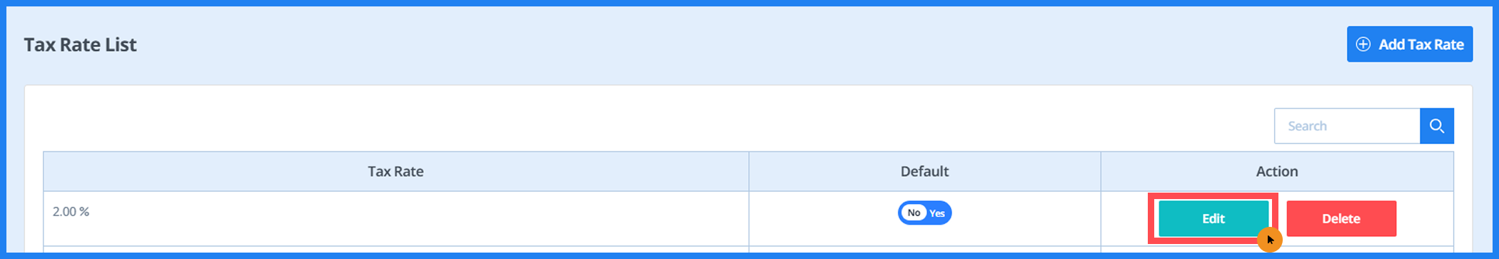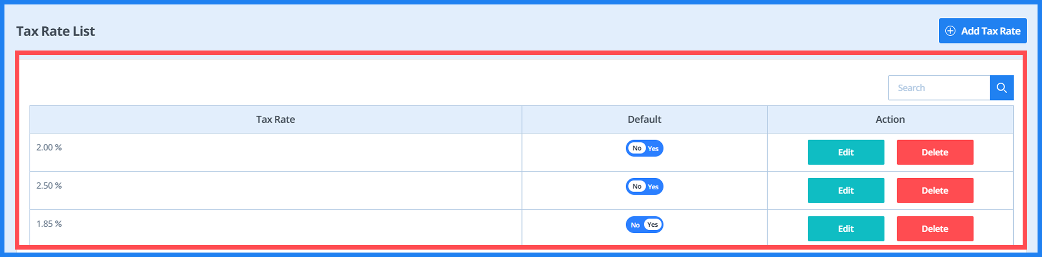 - You can see all tax rates here. You can add, edit, or delete tax rates as needed.