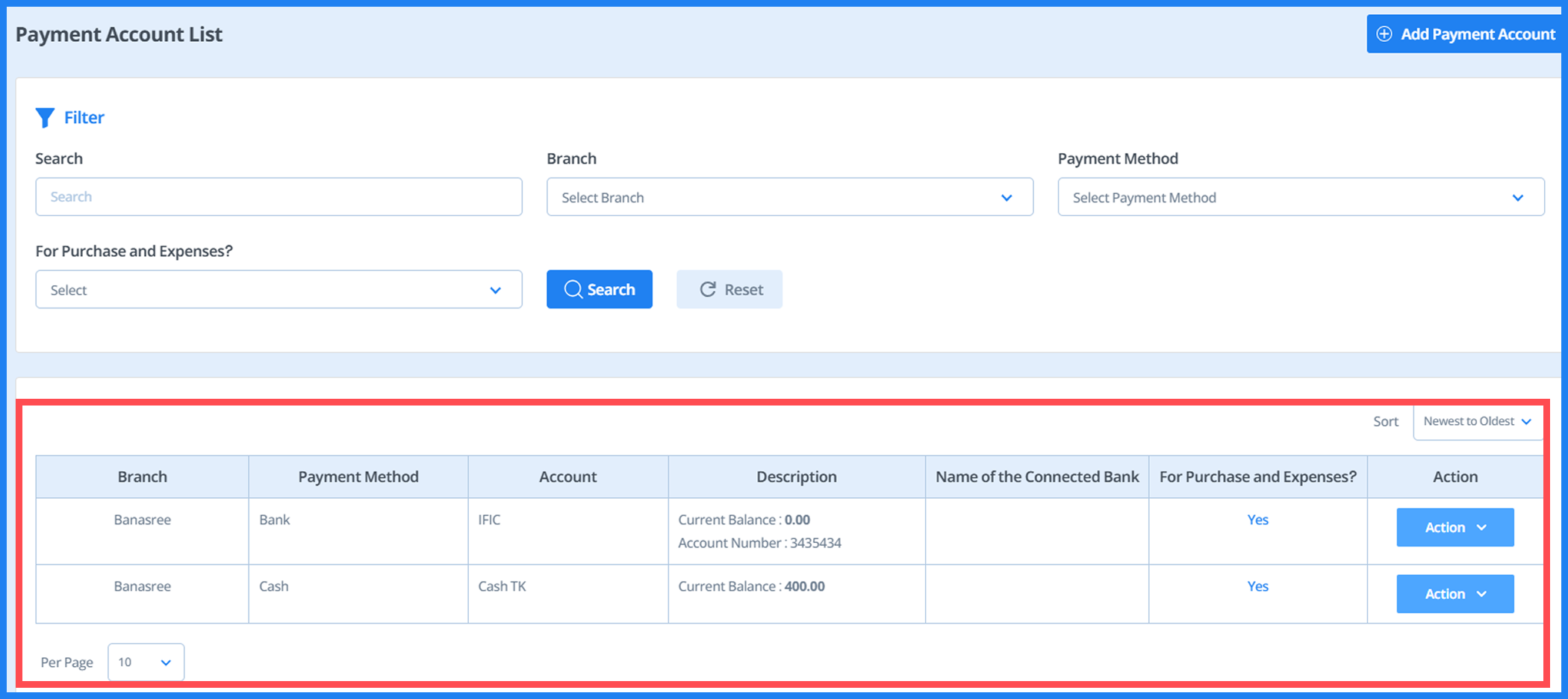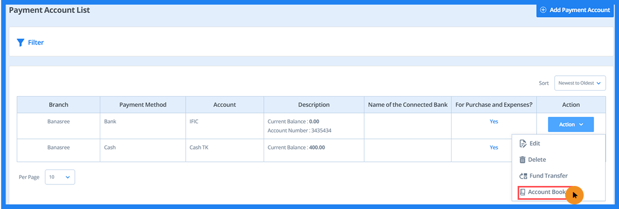 - It shows branch names, payment methods, account info, descriptions, and bank names. You can search, add, edit, and transfer funds. Check the Account Book to see transaction history.