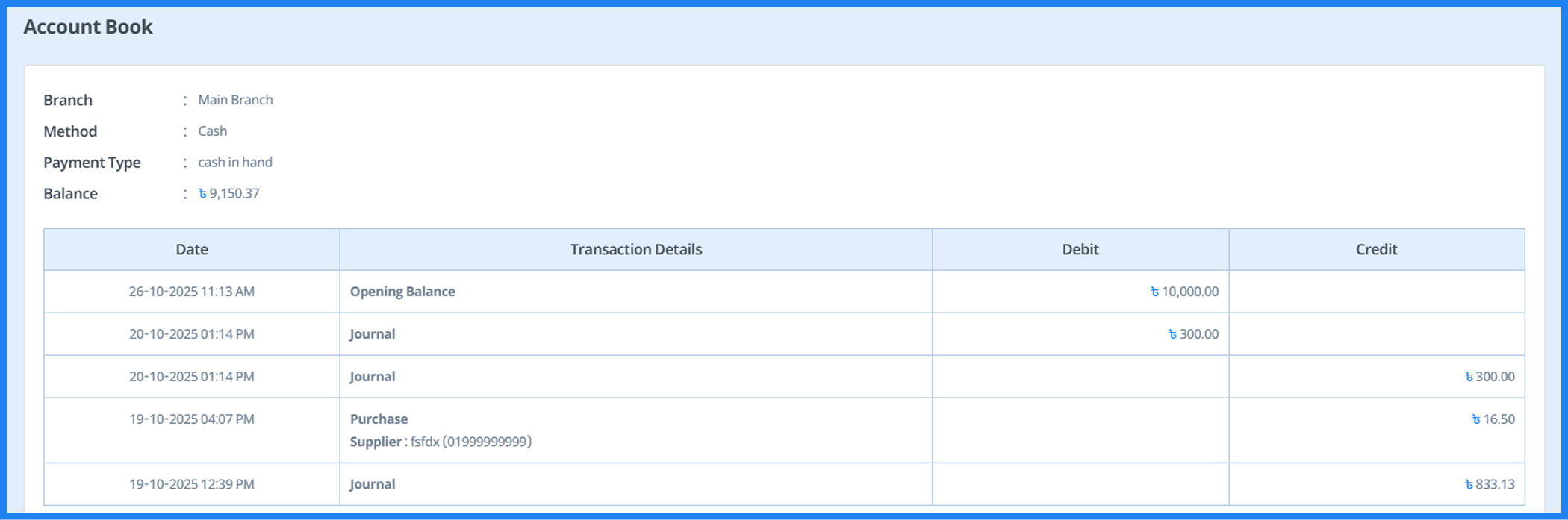 - This is account book of your selected account . You can view here date , transaction details , created at, debit, credit, balance .